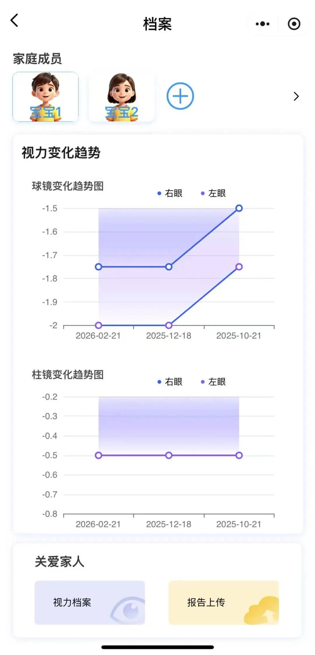 在小程序内,您还可以建立孩子视力档案,记录每次验光数据,方便对比度数变化,观察控制趋势,与医生沟通更清晰。