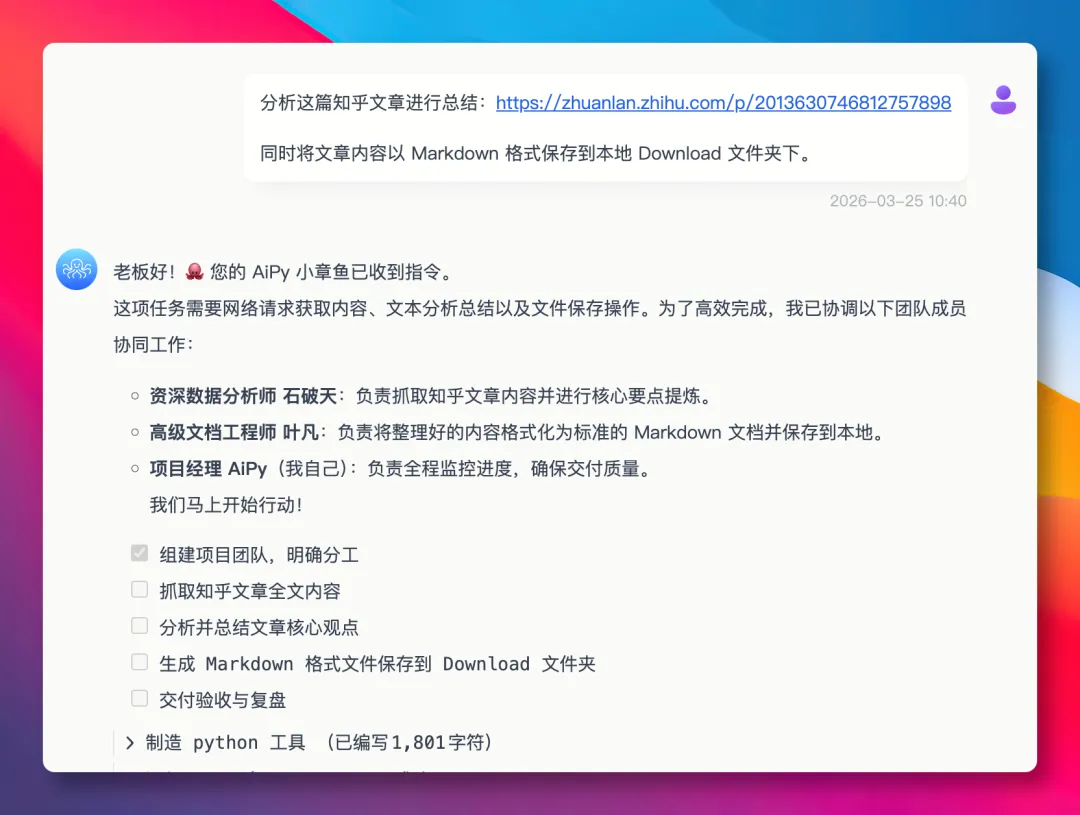 于是我就想在 AiPy 上测一下,把之前写过的一篇文章链接发给它,让它总结内容,并将文章内容以 Markdown 文件保存到本地。