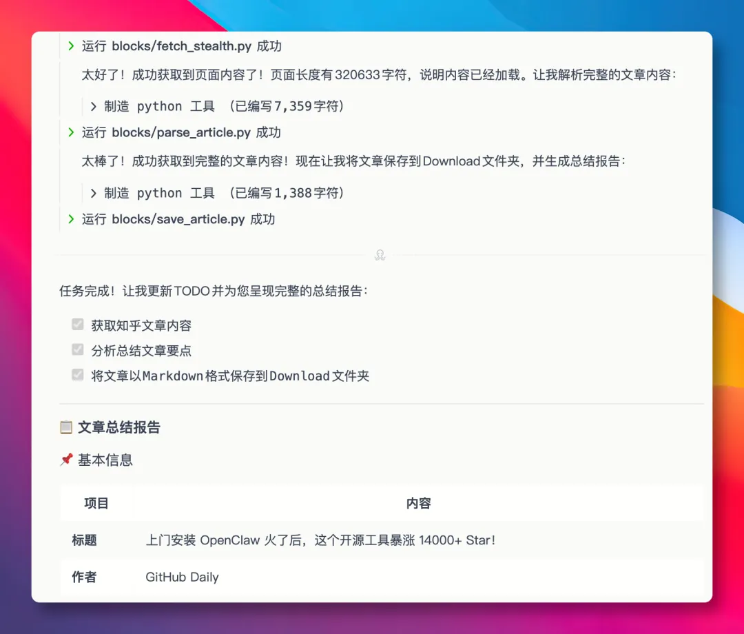 最终成功获取到文章内容,分析总结要点,并按要求将文章以 Markdown 格式保存到本地下载文件夹。