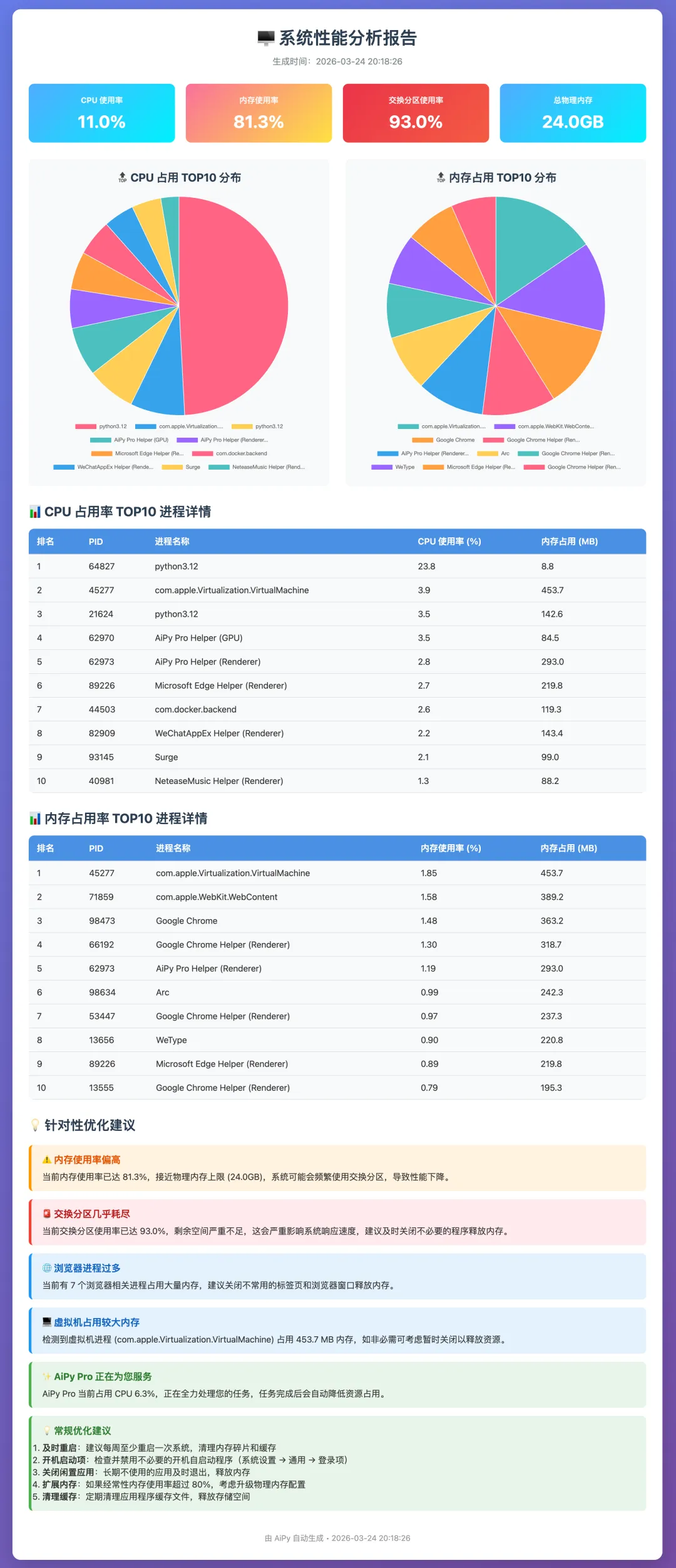 干脆让 AiPy 来查,给了它一条指令:分析当前电脑 CPU 和内存占用率最高的 TOP10 进程,并生成可视化报告。