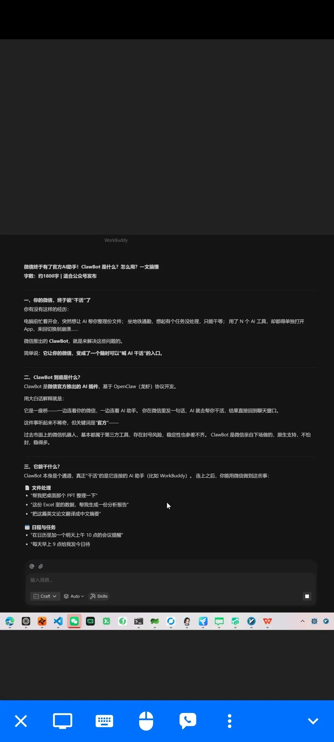 这篇文章就是完全在手机上用个人微信(非企业微信)遥控电脑上的WorkBuddy编写的!请看文中的用法,安装➕扫码登录即可。