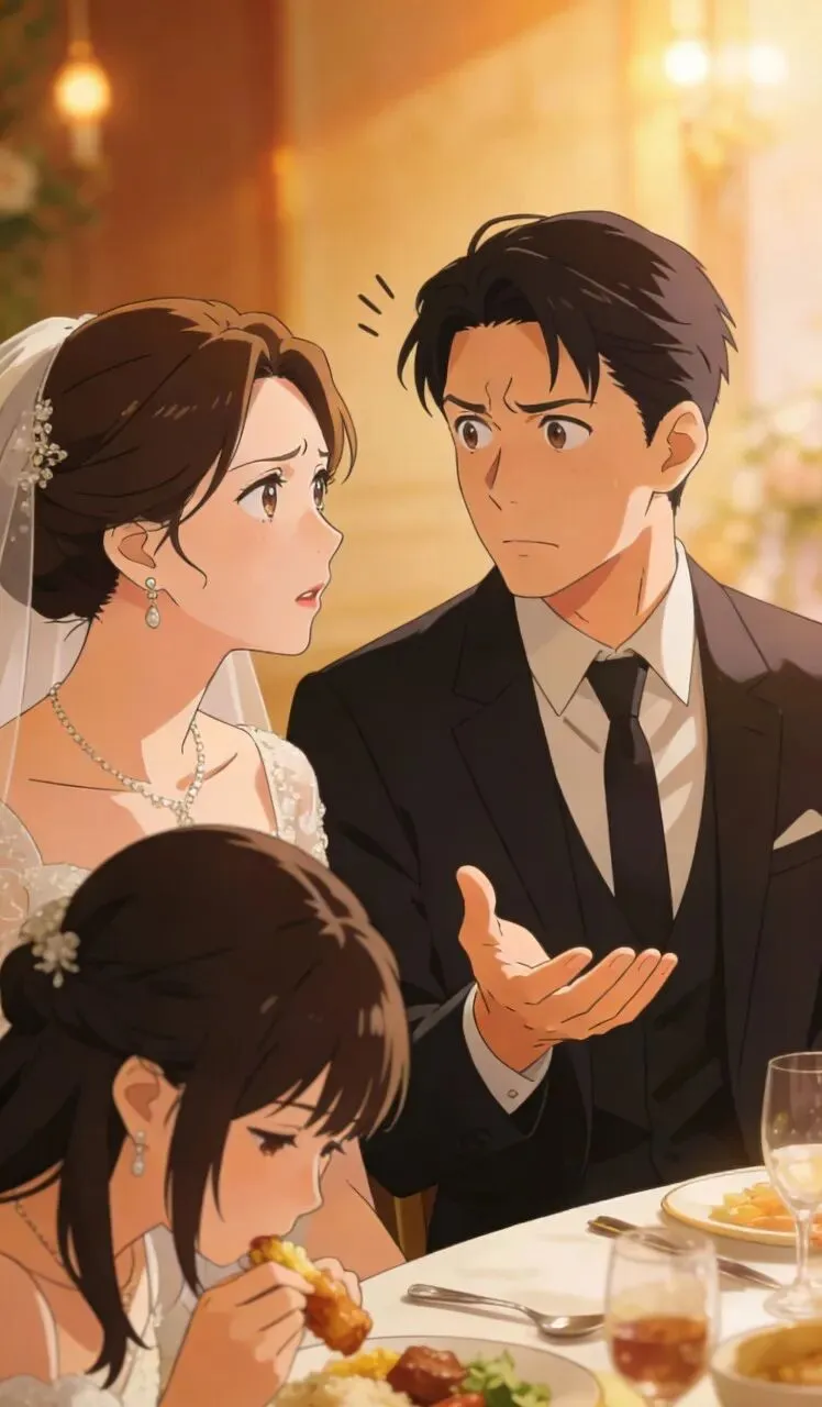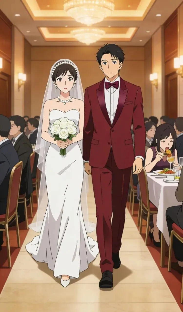 3. 身着洁白婚纱的新娘与穿红色西装的新郎并肩走来,看到陌生的顾雪莉,两人面露疑惑,慢慢走到她的桌前,气氛瞬间变得有些紧张。