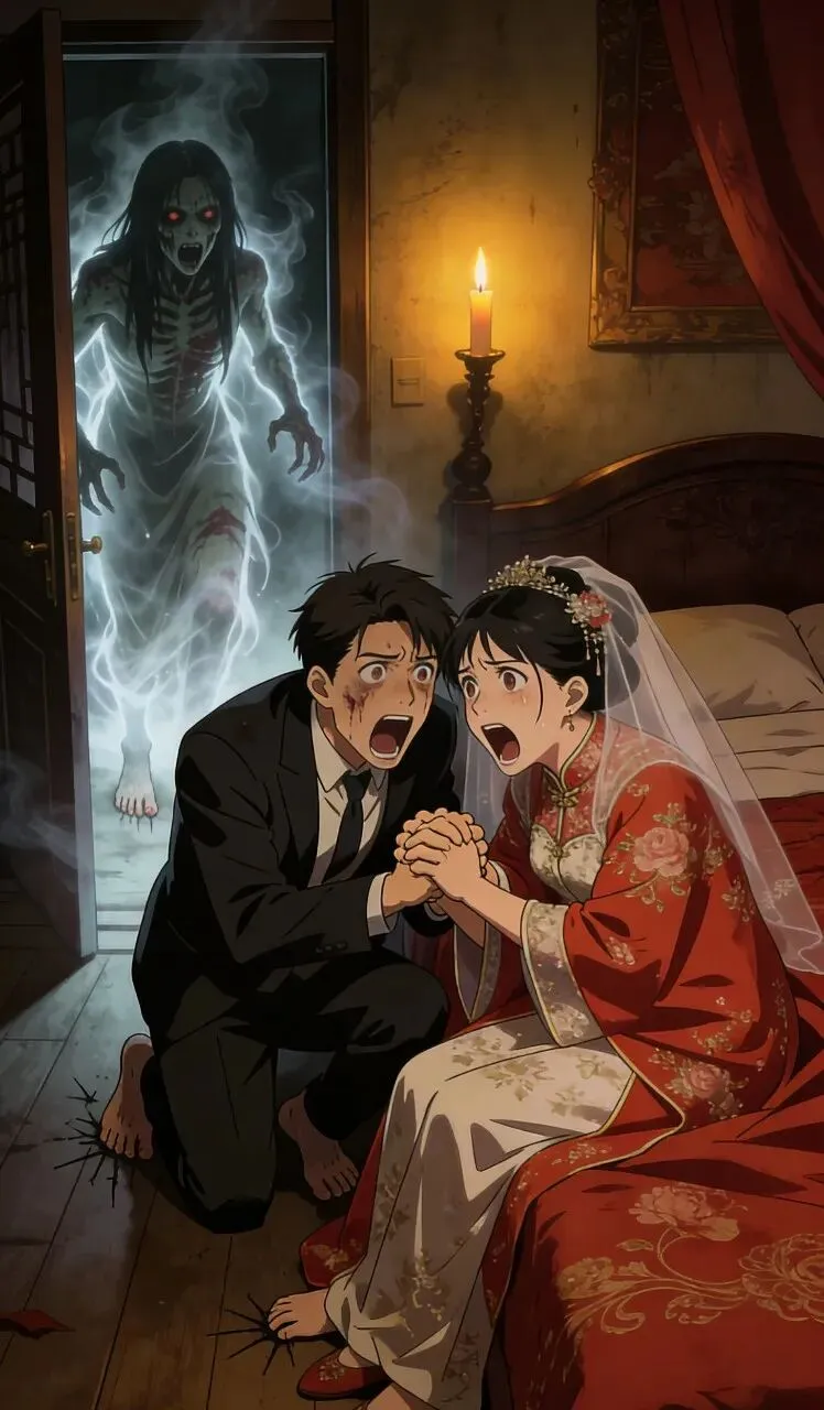 14. 新郎新娘惊恐尖叫,连连后退,想要逃跑却被僵尸周身的阴气困住,浑身发抖,根本无法挪动脚步,场面十分惊悚。