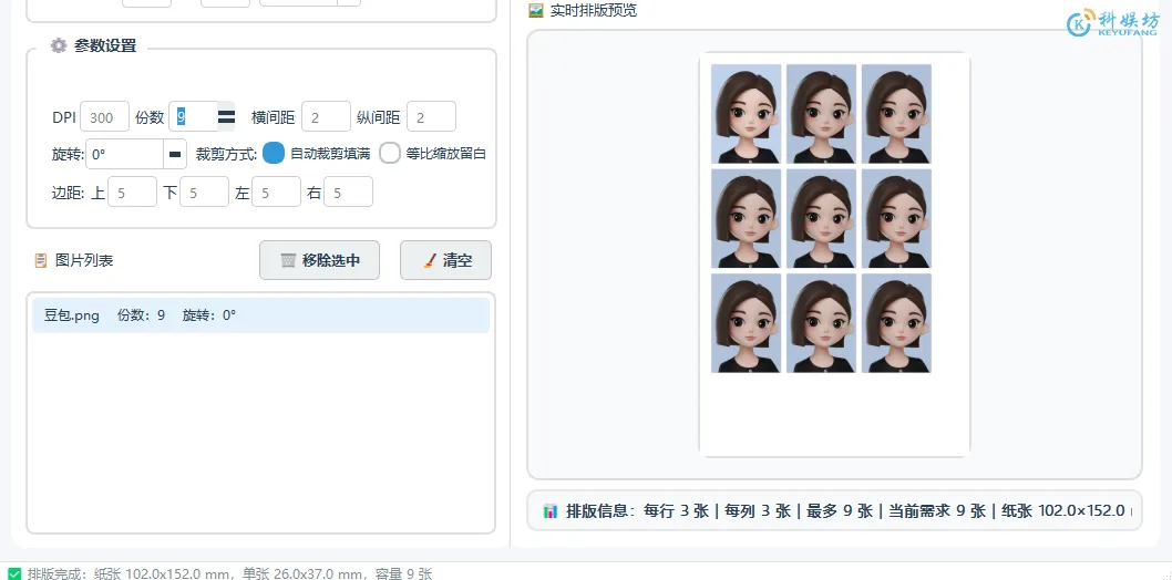 参数设置方面,可以调整图片的DPI、份数(也就是照片张数)、横间距、纵间距、角度、边框等,基本上都可以调整。