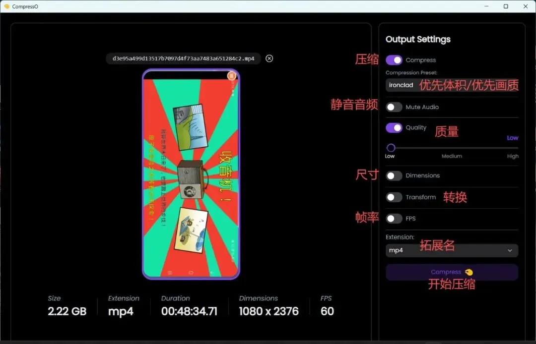 压缩、优先缩小体积/优先保留画质、静音音频、质量(压缩力度)、尺寸(分辨率)、转换、帧率、拓展名