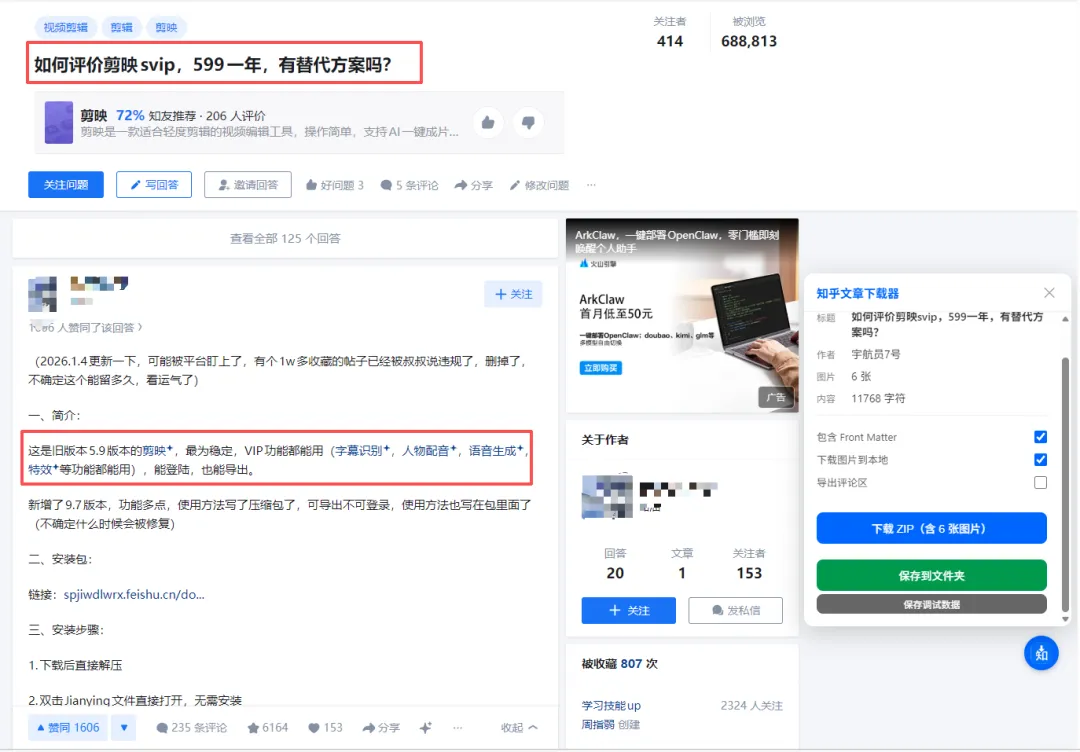 最近我挖到一款零差评浏览器插件——知乎文章下载器,打开知乎页面点一下,就能把回答、文章、想法、收藏夹完整导出成Markdown文件,格式、图片、排版原样保留,本地存好永久不怕删。