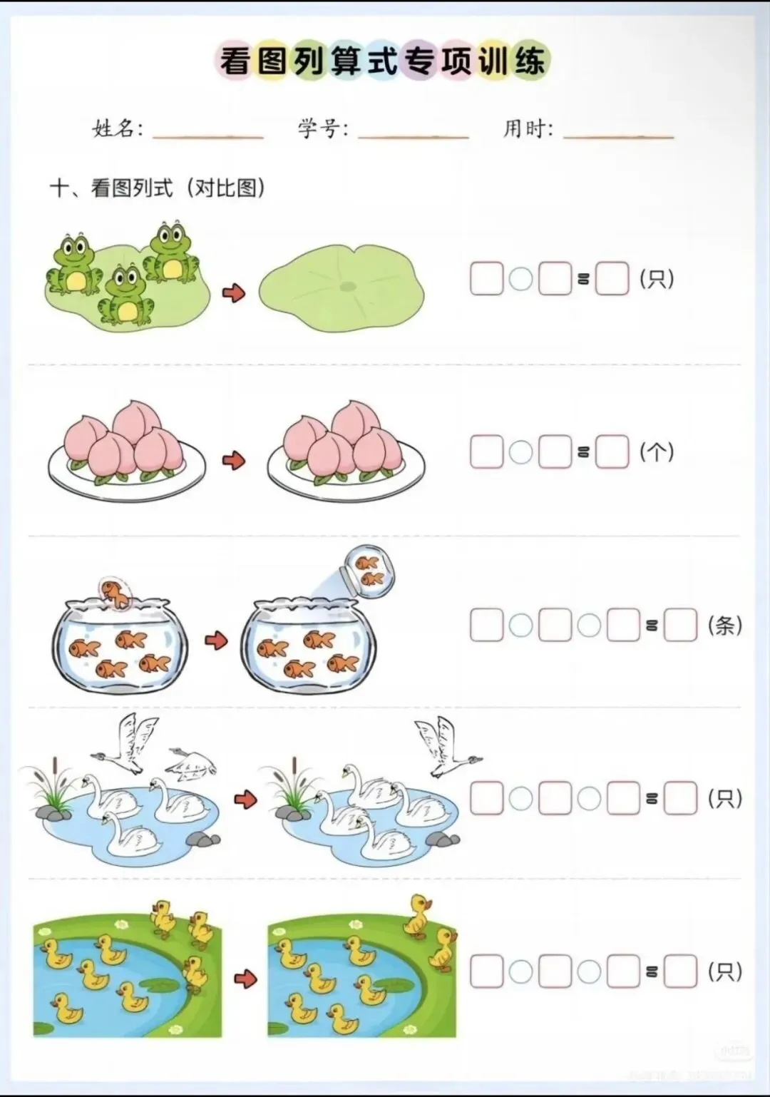 一年级数学看图列式专项练习(高清可打印PDF),10大题型口诀+练习,轻松攻克难点!