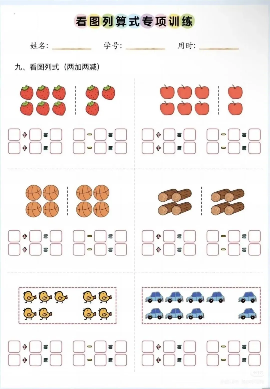 正在学习或复习一年级上册/下册数学看图列式的小学生;适合需要巩固基础、进行专项突破的孩子家庭使用。