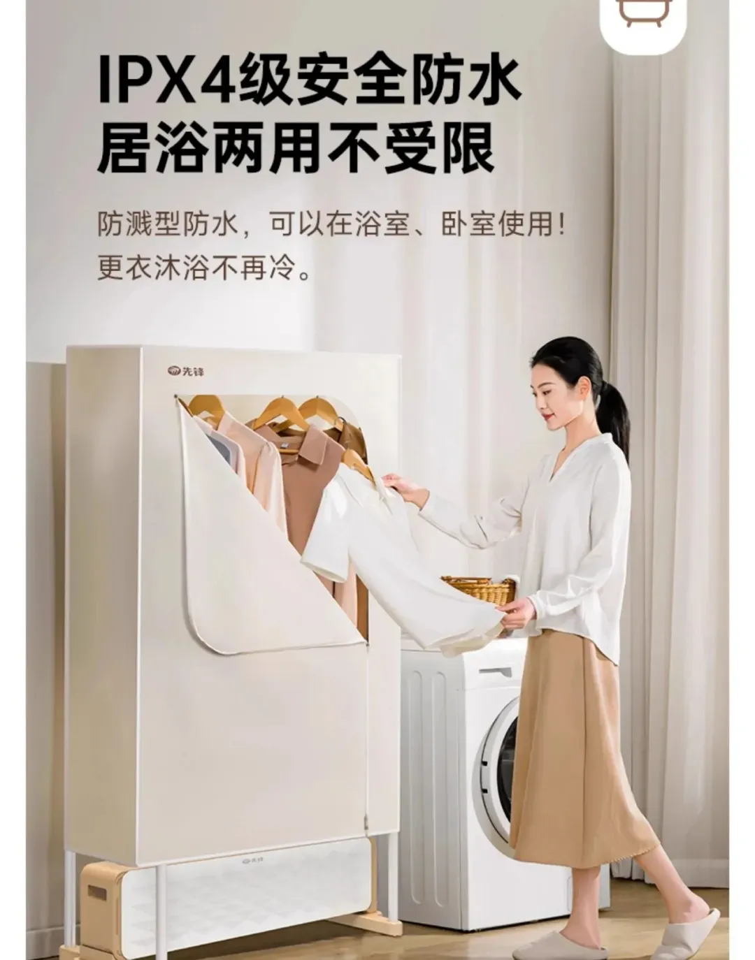 这才是它的“杀手锏”!把湿衣服挂进专属的烘干罩里,拉上拉链,一个密闭的温暖空间就形成了。无论是宝宝的连体衣、大人的衬衫,还是厚重的羽绒服,都能在里面快速烘干。而且,它内置了蒸发加湿盒,在烘干的同时还能保持室内空气湿润,避免过度干燥引起呼吸道不适。