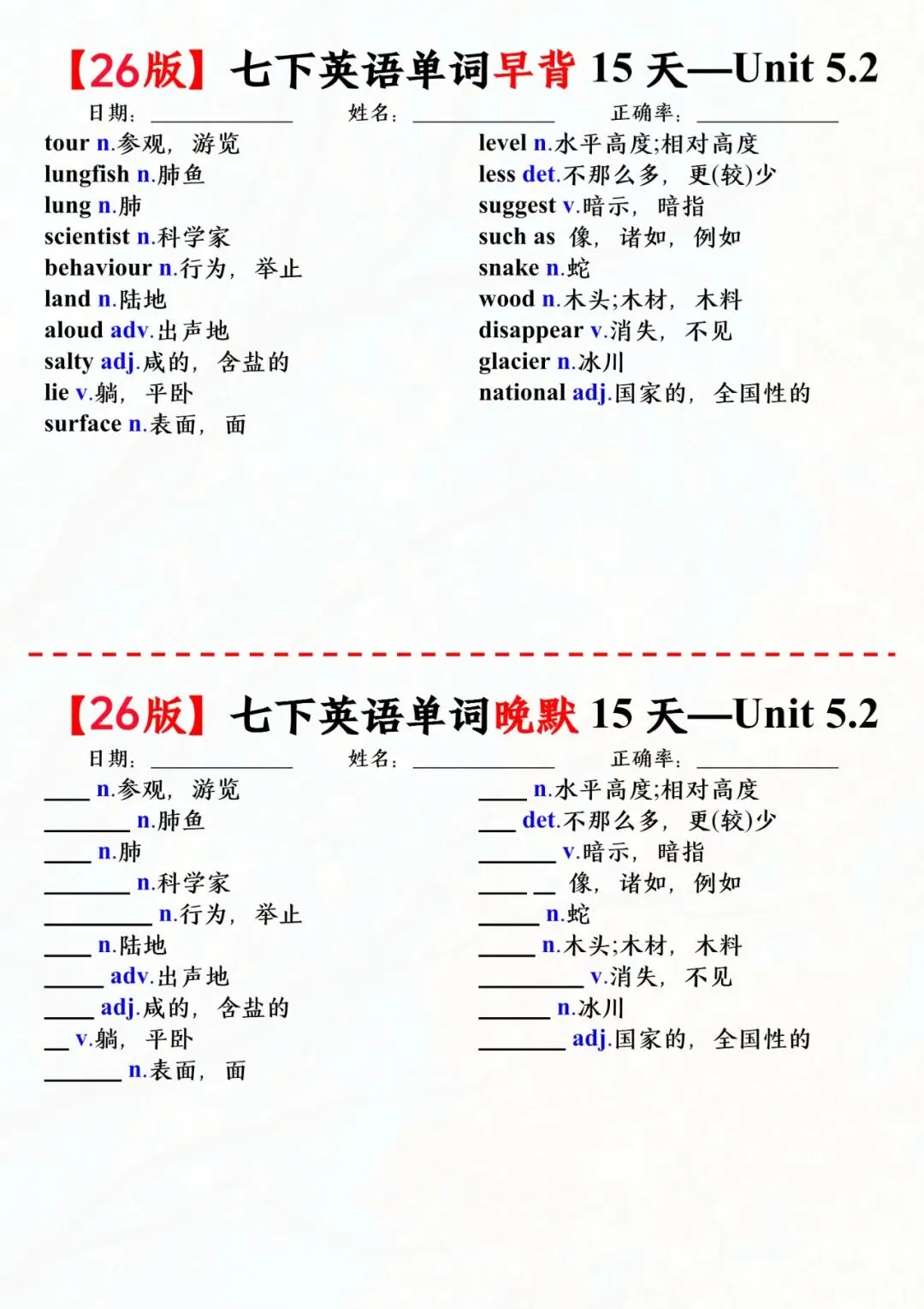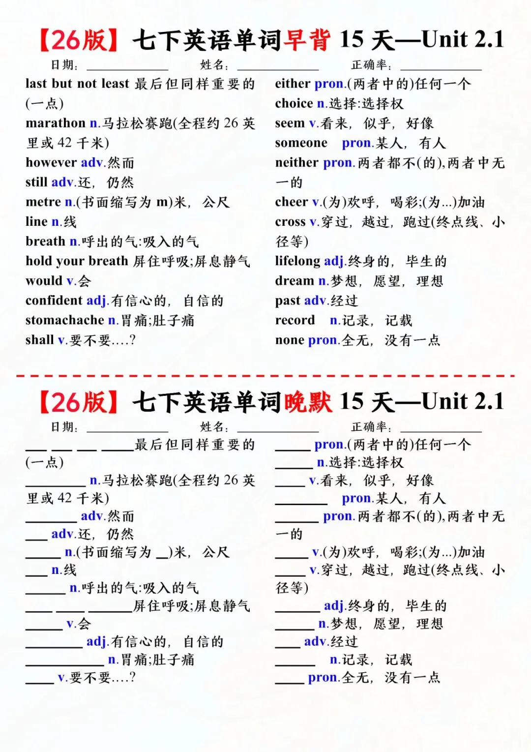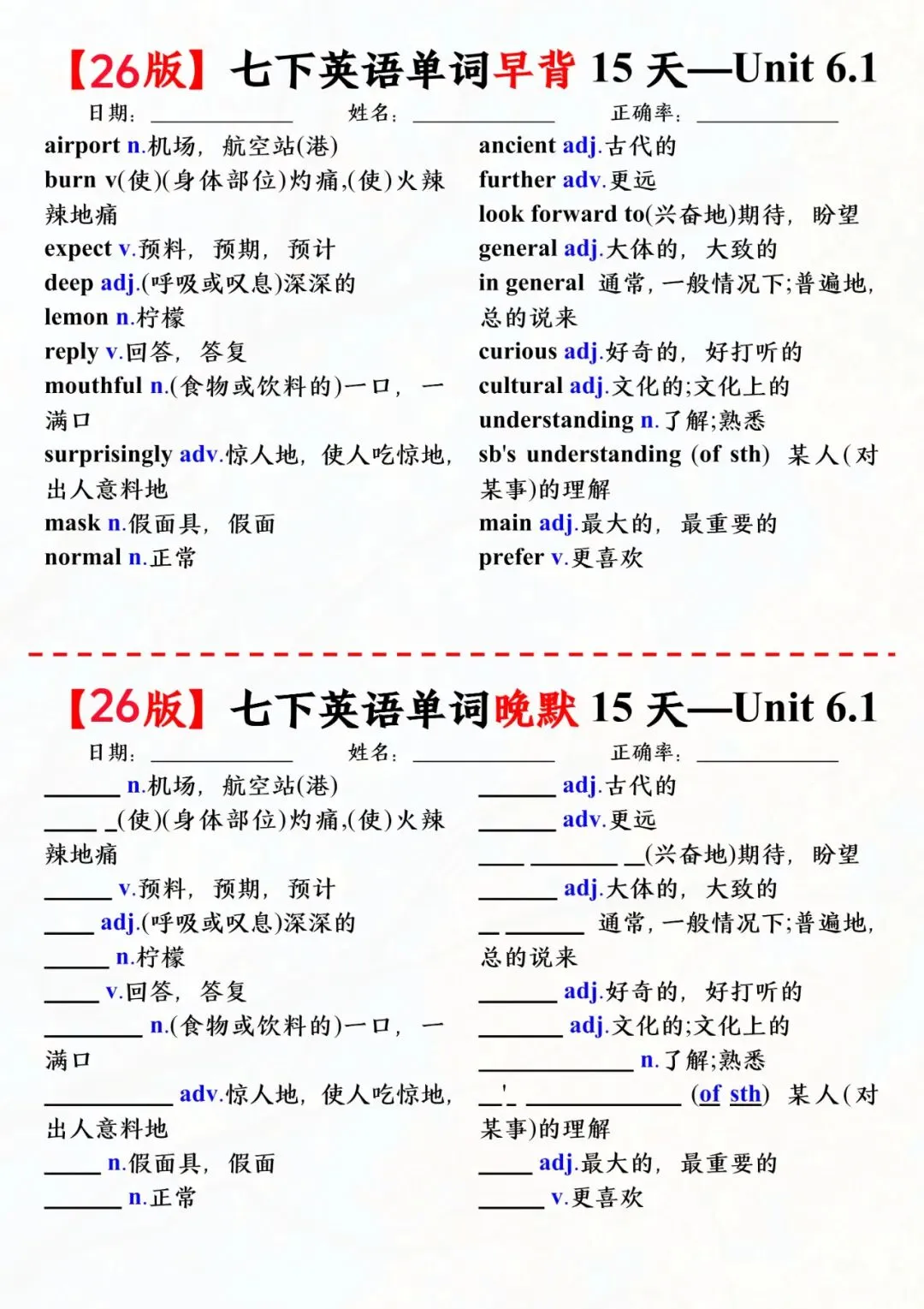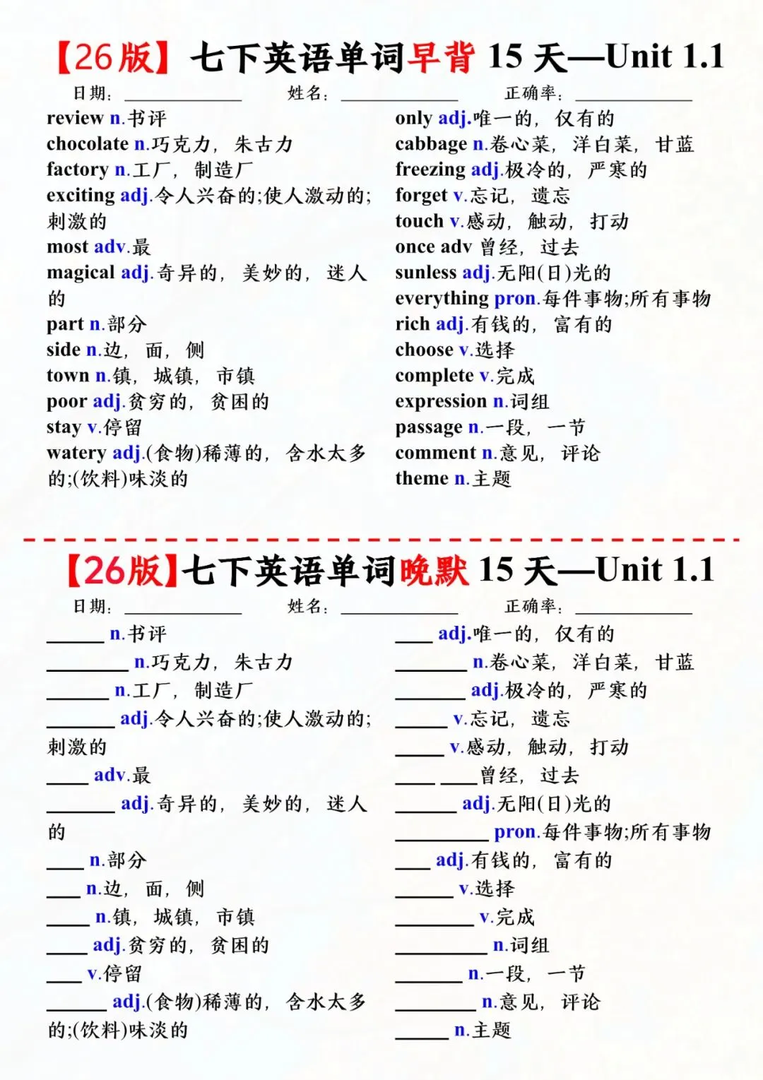 七年级下册英语外研版单词早背晚默小纸条电子版可打印