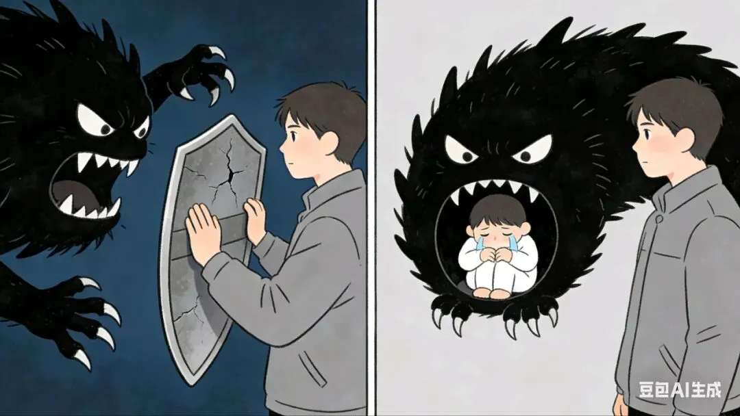 左边是一个人用盾牌抵挡黑色情绪怪兽,越挡怪兽越大;右边是他放下盾牌,怪兽逐渐变小,露出里面委屈的小人)