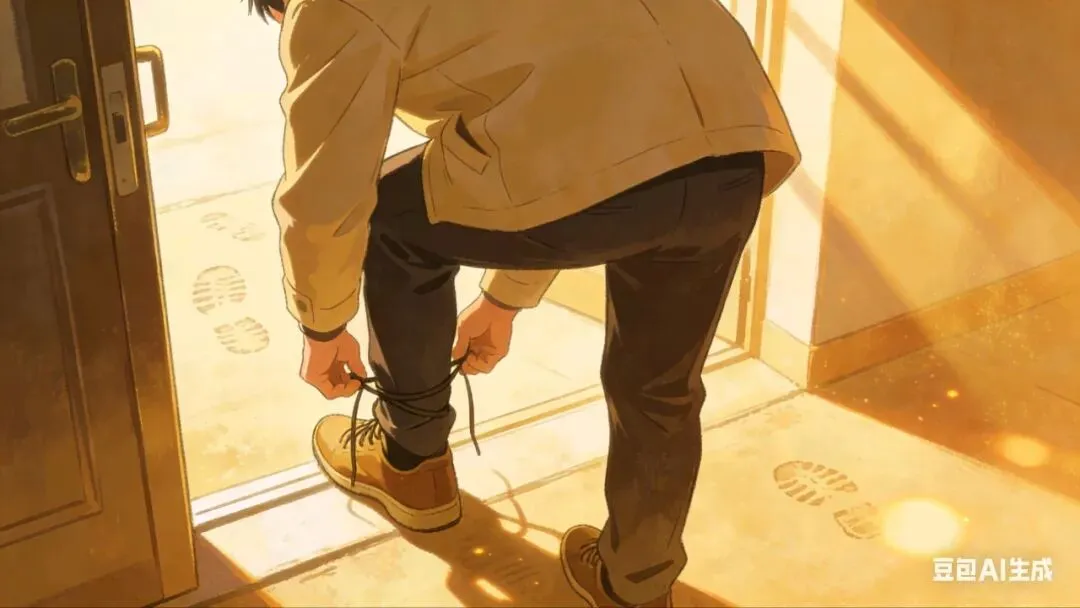 一个人瘫在沙发上,旁边放着跑鞋和书本;5分钟后,他系好鞋带出门,阳光洒在背影上)