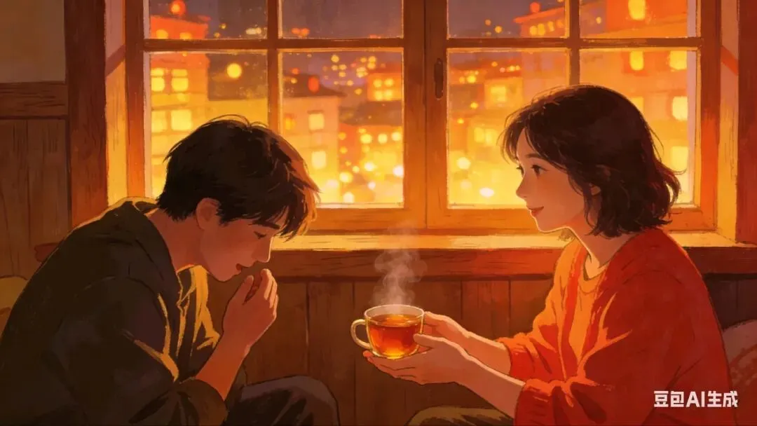 两个人坐在窗边,一个人低头说话,另一个人递上一杯热茶,窗外是万家灯火)