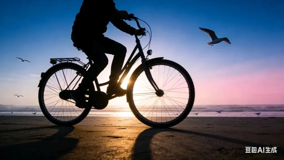清晨的海边,一个人骑着自行车,身后是逐渐亮起的天空,远处有海鸥飞过)