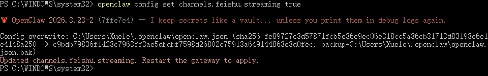 openclaw config set channels.feishu.streaming true