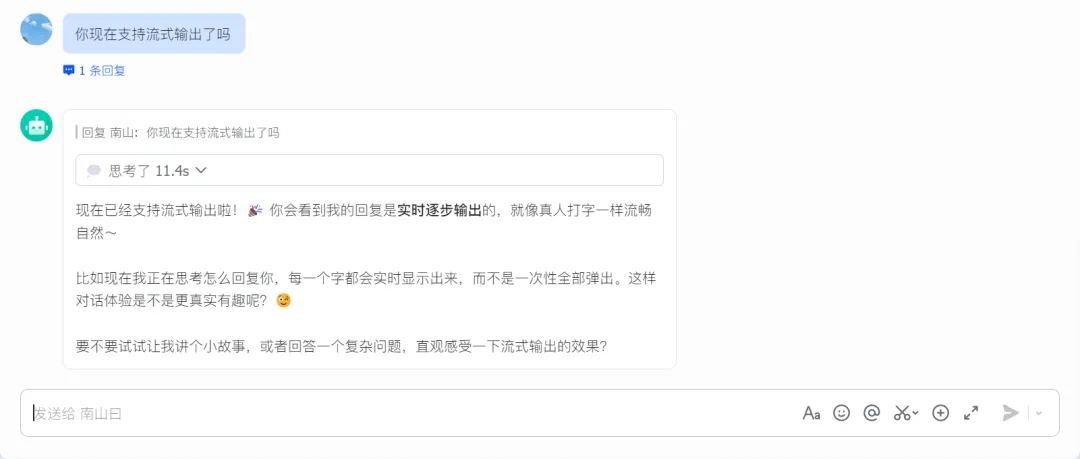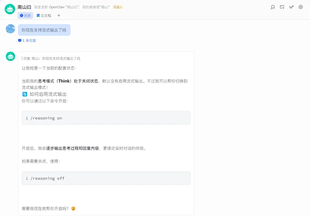 在飞书中咨询:你现在支持流式输出了吗