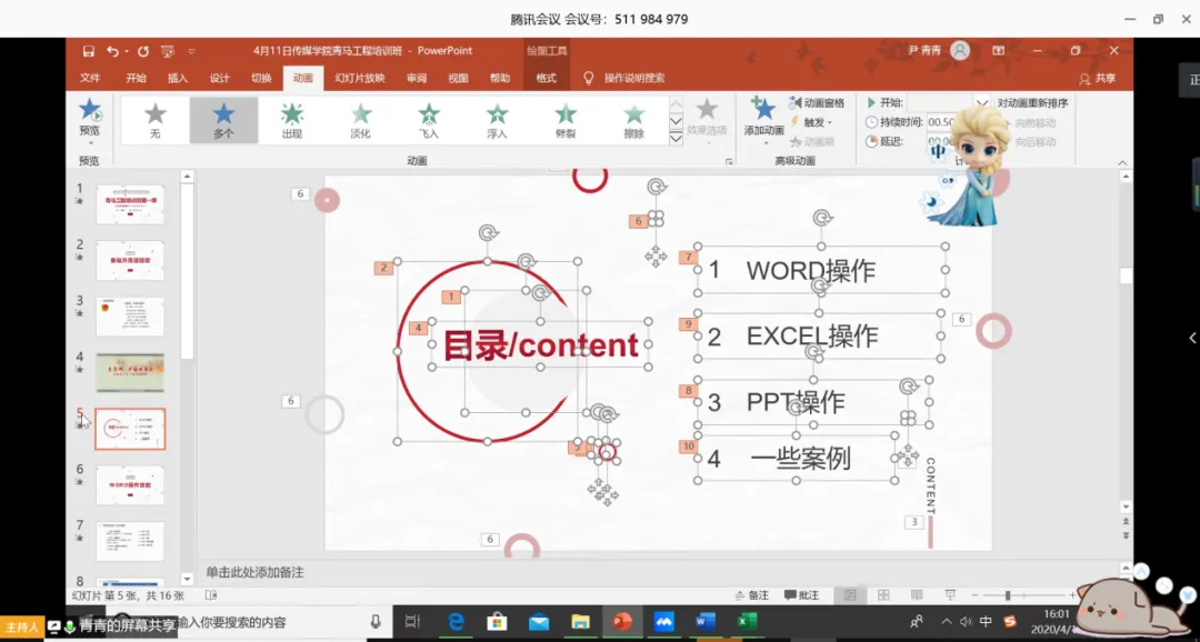 课程的最后一部分主要介绍PPT的使用和动画的制作处理。尹青青老师还针对同学们的特点,通过案例分析,对同学们日常工作中的常规操作和易犯错误做了重点提醒,直观有效地展示了办公室软件的魅力,让人受益匪浅。