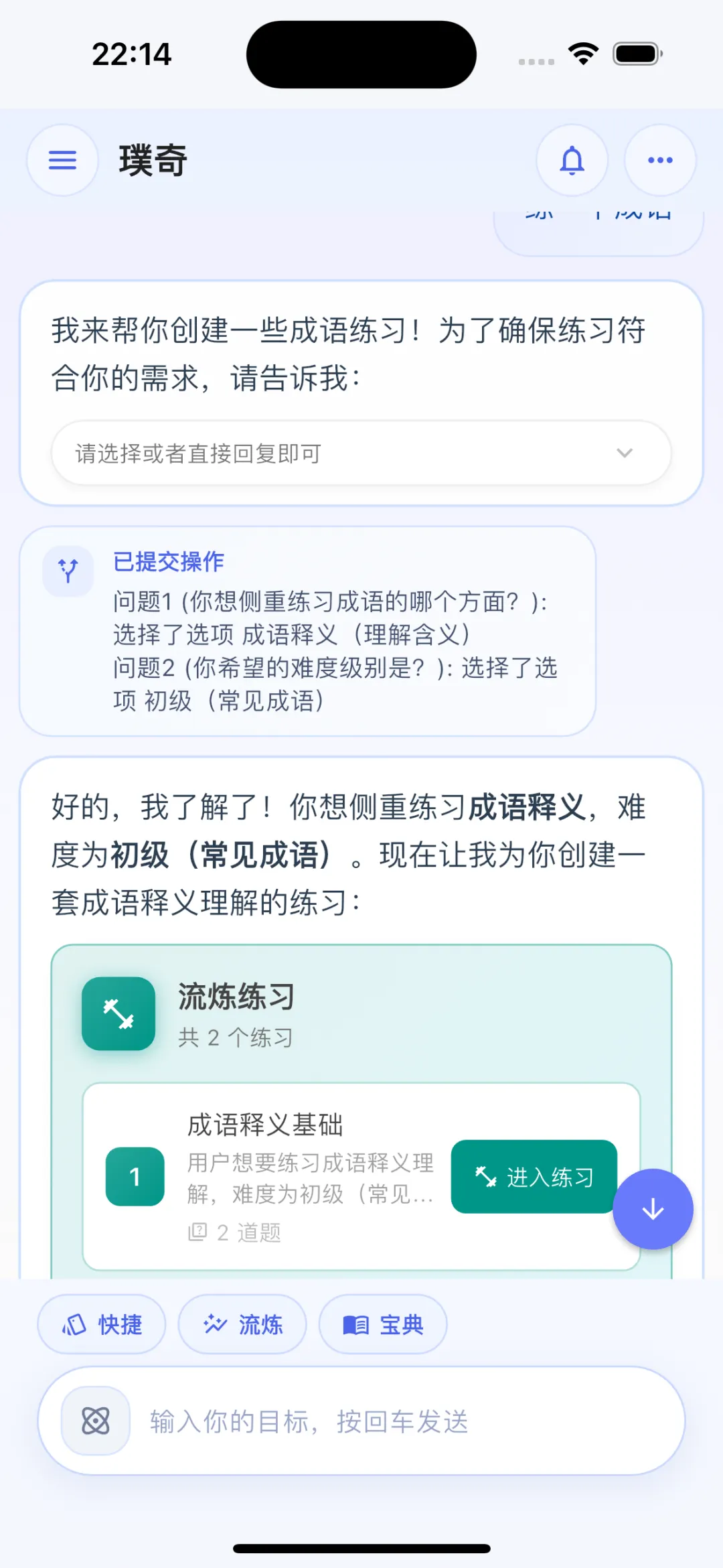 具体来说,当用户在对话中表达需求时,AI 不仅返回文字内容,还会动态生成对应的交互组件。比如用户说「我想做成语练习」,AI 会生成一个包含「流炼练习」卡片的回复,用户直接点击卡片即可进入练习。