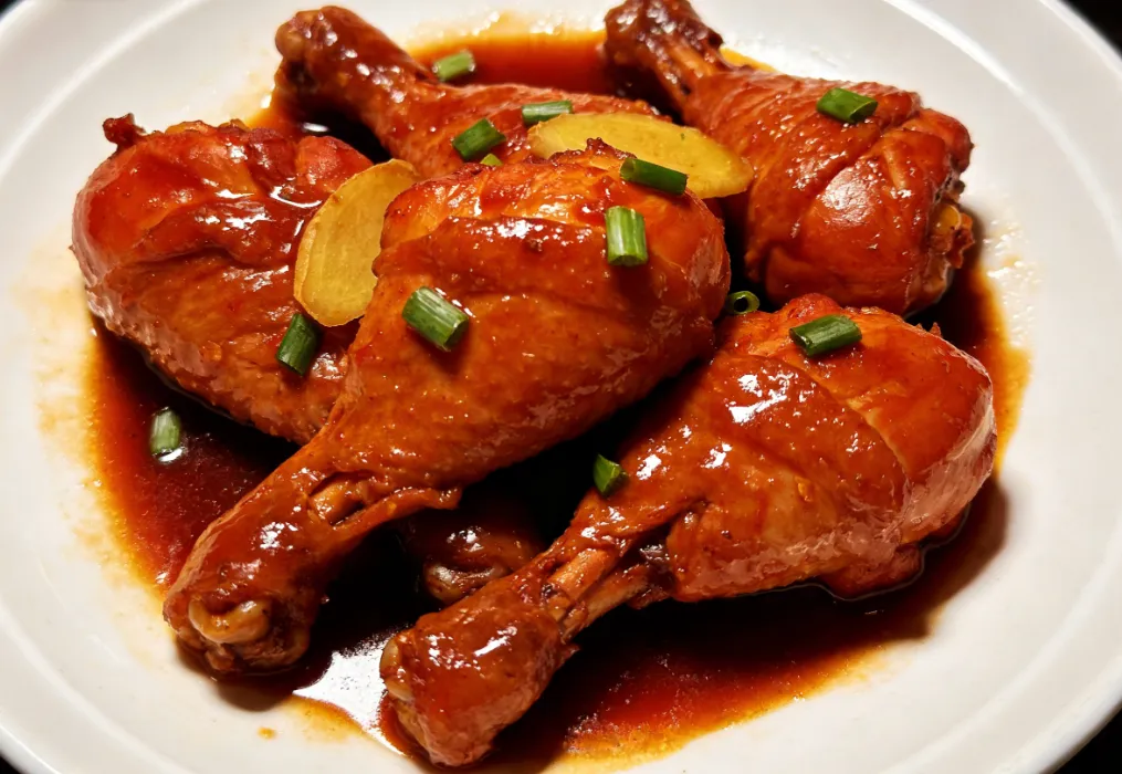 收汁出锅:开大火收汁,待汤汁浓稠挂在鸡腿上,加少许盐调味,撒上葱花点缀即可。