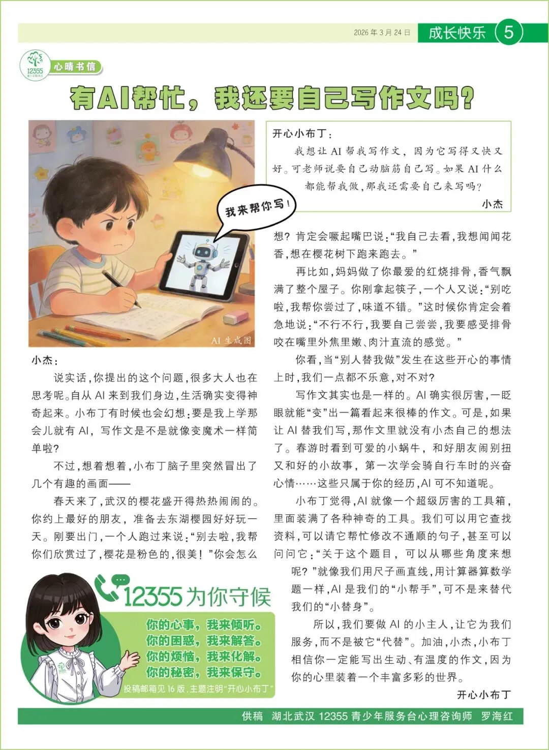最近,一名小学生向湖北武汉 12355 青少年服务台倾诉了自己的困惑,说出了许多孩子的心里话。