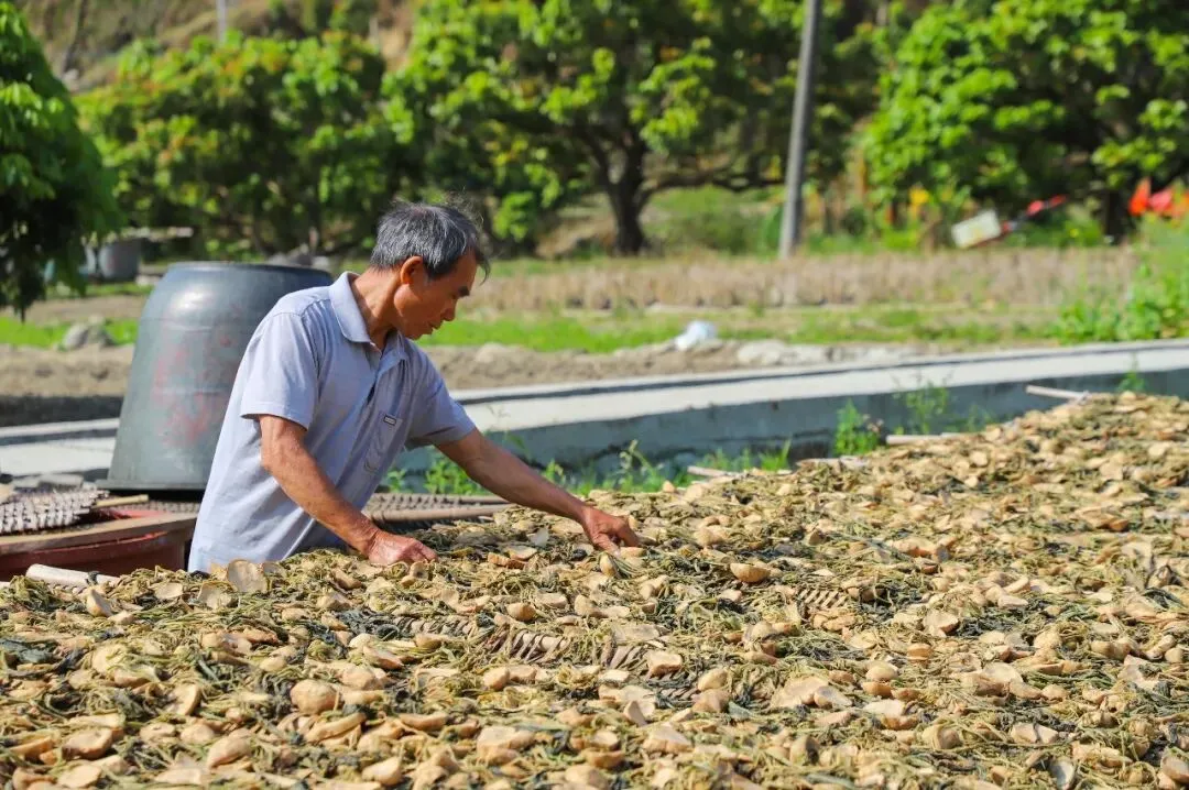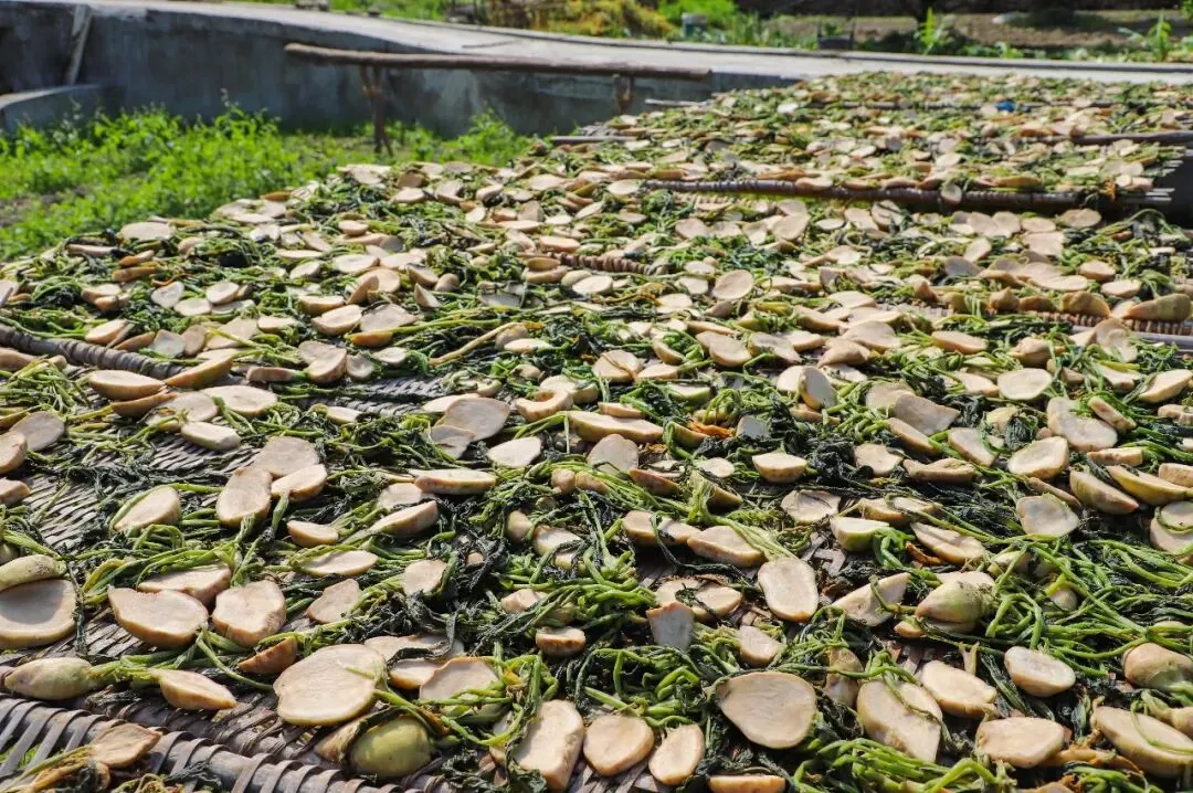 丽沙村种植大头菜历史悠久。得益于山区优良的生态环境,这里出产的大头菜肉质细嫩、香味浓郁,无论是搭配煲猪肉、蒸扣肉,还是佐粥下饭,都深受消费者喜爱。今年,全村大头菜种植规模稳中有升,品质普遍优于往年。采收结束后,村民们将新鲜大头菜运回,用清水洗净、切分整形,随后整齐铺在竹匾或晾晒架上,借助阳光自然风干,为后续加工做准备。