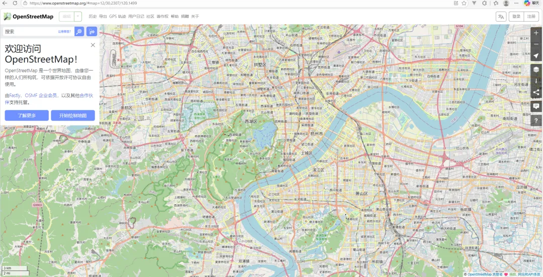 打开OSM官网:https://www.openstreetmap.org/(注意:境外网站,国内可能需要科学上网,实测能正常打开) -