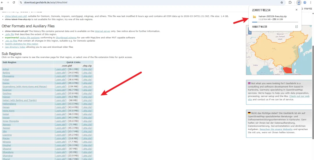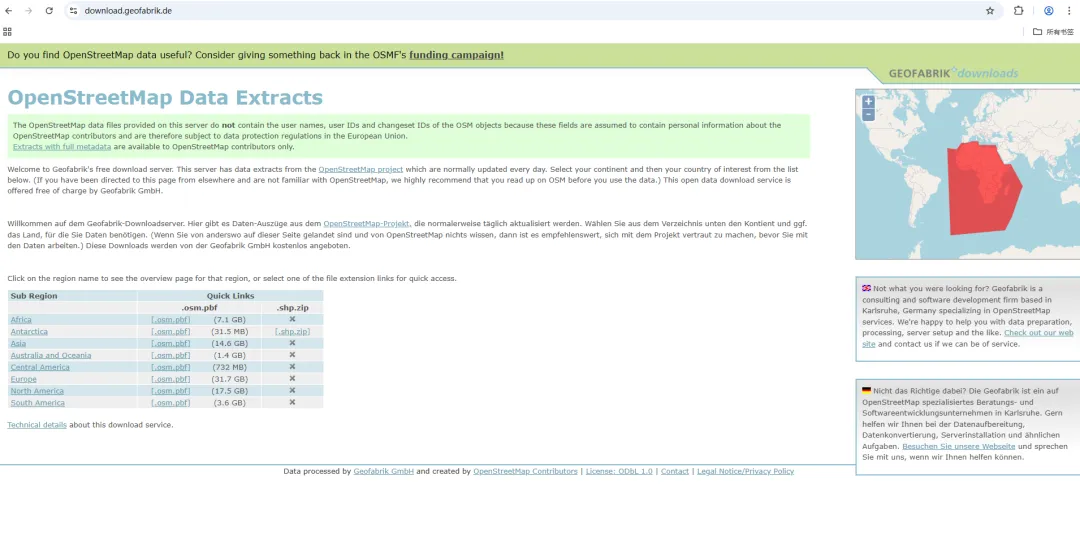 打开Geofabrik下载页:https://download.geofabrik.de/(国内直接打开,不用科学上网)