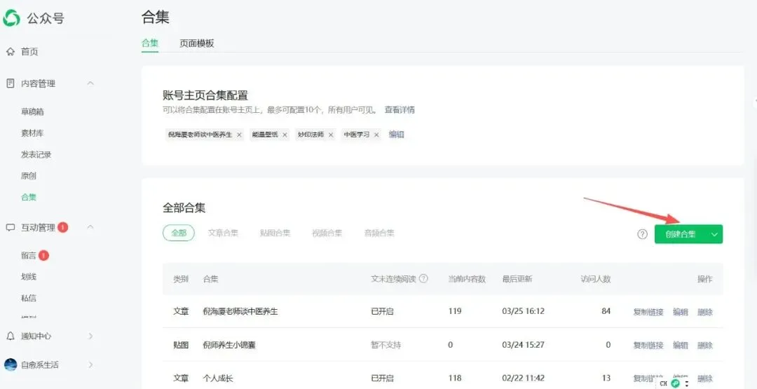 1. 公众号文章下拉,有合集,可以选已经建好的,也可以新建一个