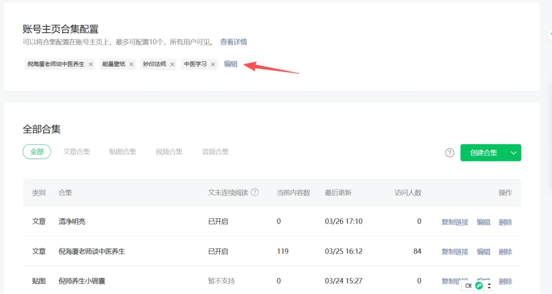 4. 现在该展示在公众号首页上了,点击编辑合集,把你想要展示的合集勾选上,还可以调整位置哦