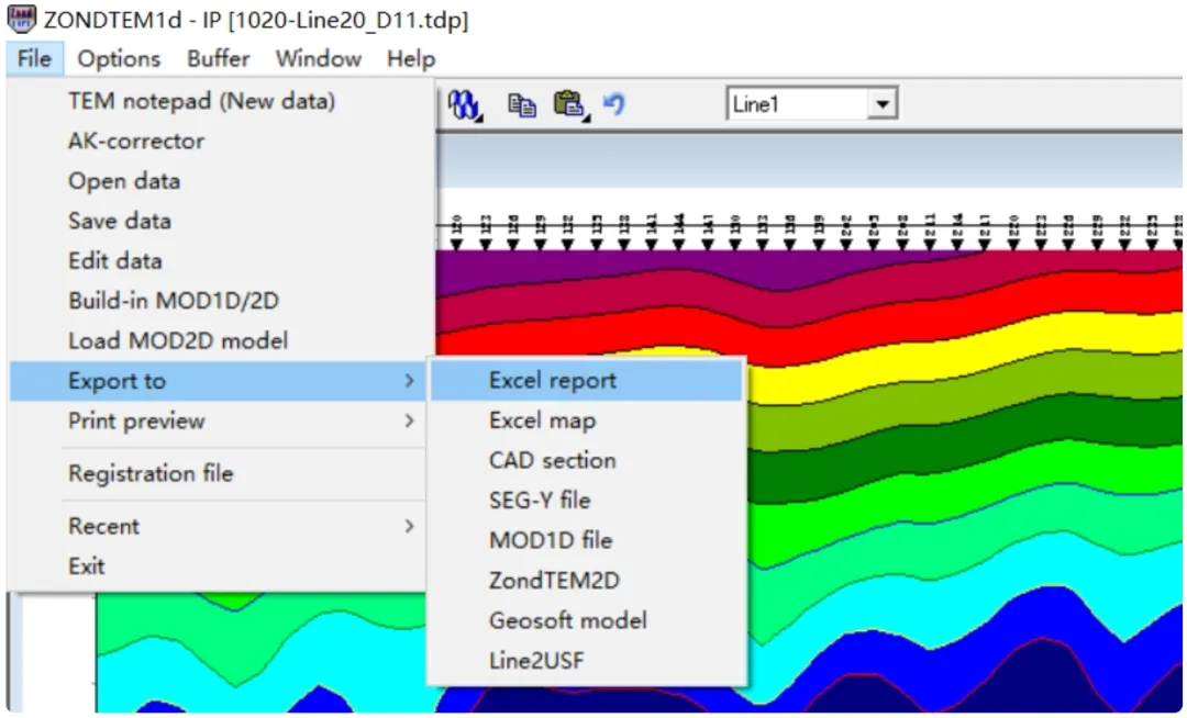 (1) 打开zondtem1d反演工程文件(*.tdp),点击”File” -> “Export to” -> “Excel report”