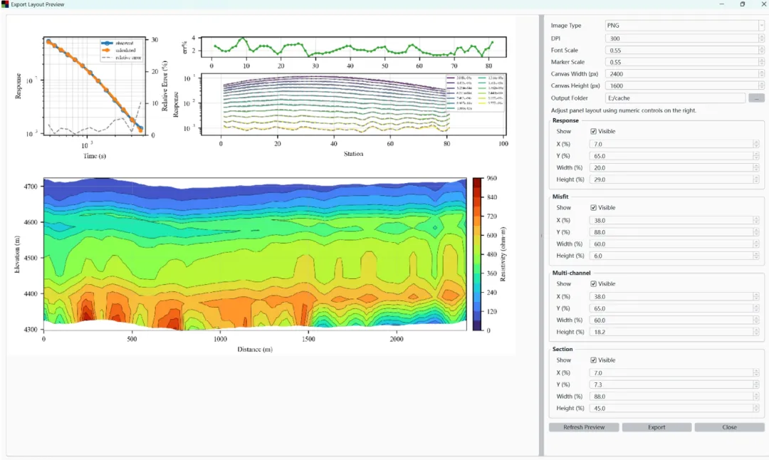 – 用途:在导出前统一设置四类子图(Response / Misfit / Multi-channel / Section)的版式与导出参数。
