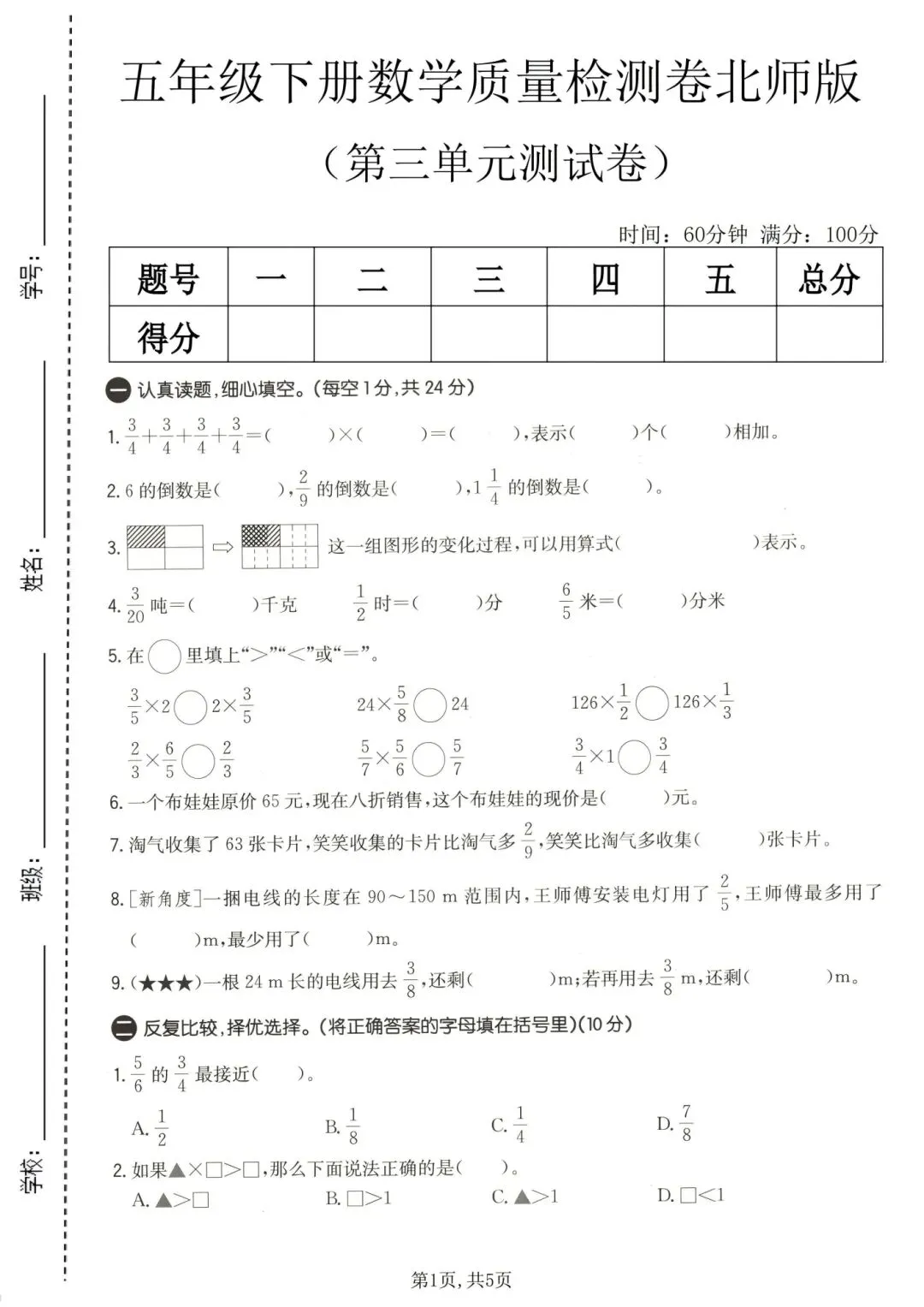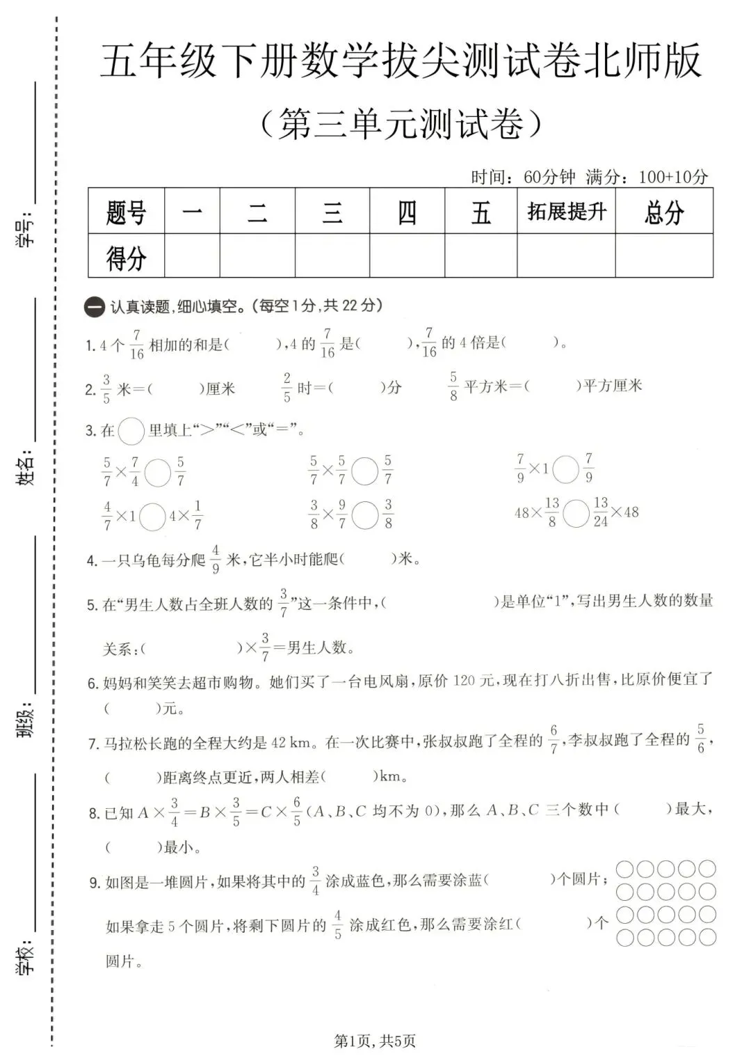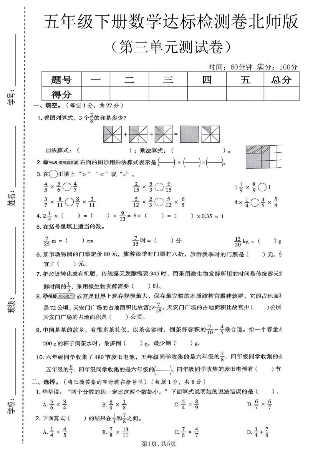 2026春五年级下册北师大版数学,第三单元检测试卷3套,含答案,电子版可下载打印。这三套卷子针对五年级下册第三单元(分数乘法),含质量卷、模拟卷、提升卷,建议先做质量卷模拟卷打基础,再用提升卷挑战,及时查漏补缺再针对性提高,需要的朋友抓紧领取,让孩子用起来吧💪!小伙伴赶紧分享给班级群或者家长群,免得回头找不到哦!
