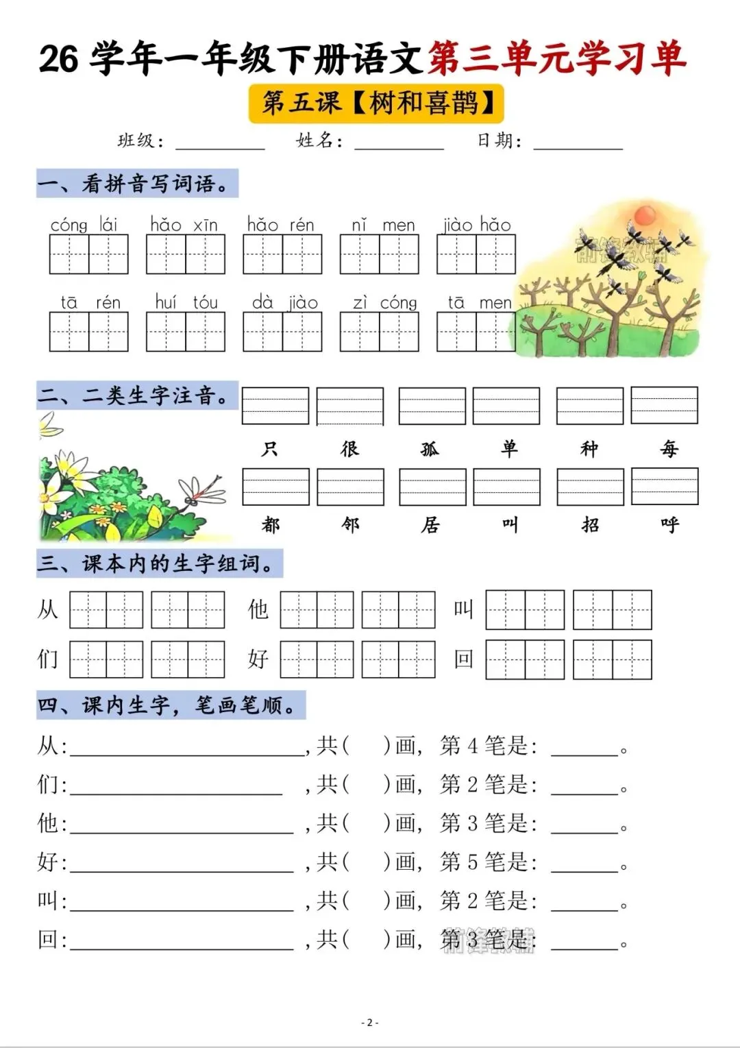26春《一年级下册语文第三单元学习单》电子版可打印