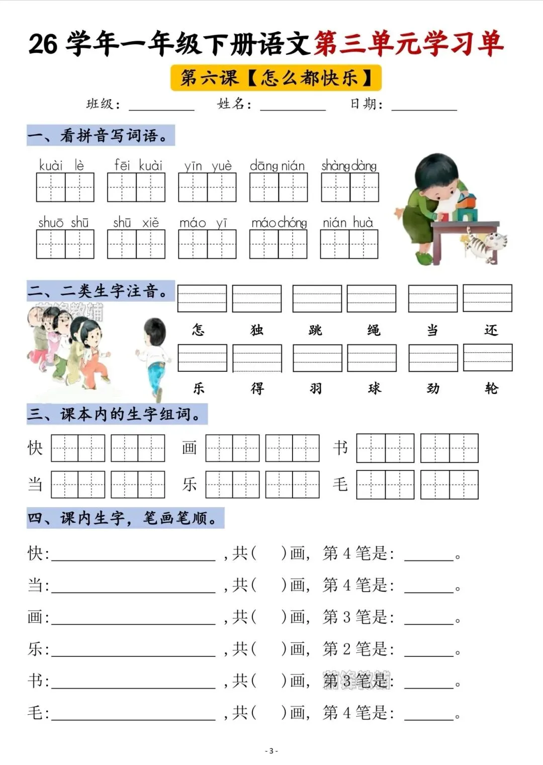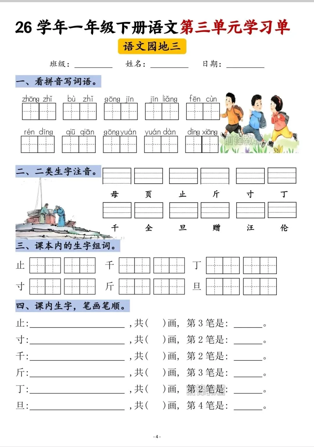 今日分享26春《一年级下册语文第三单元学习单》电子版可打印,对应第四至六课及语文园地三的内容,每部分均设置看拼音写词语、二类生字注音、课内生字组词、课内生字笔画笔顺四类基础练习,聚焦单元生字词的认读、书写和基础运用。