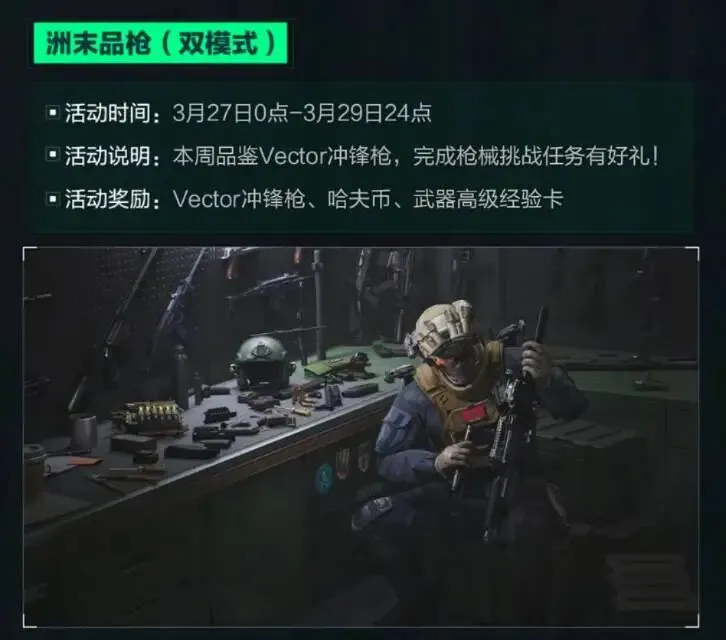 官方公告将于3月27日0点开启品枪活动,本次品枪主角为:Vector冲锋枪
