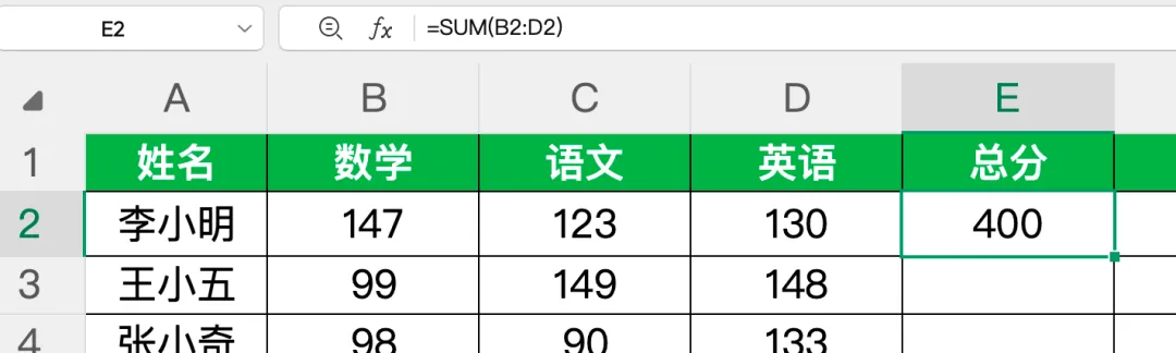 也可直接在总分单元格输入SUM 函数公式=SUM(B2:D2)(B2:D2 为各科成绩区域),回车后下拉填充,结果一致,可根据使用习惯选择。