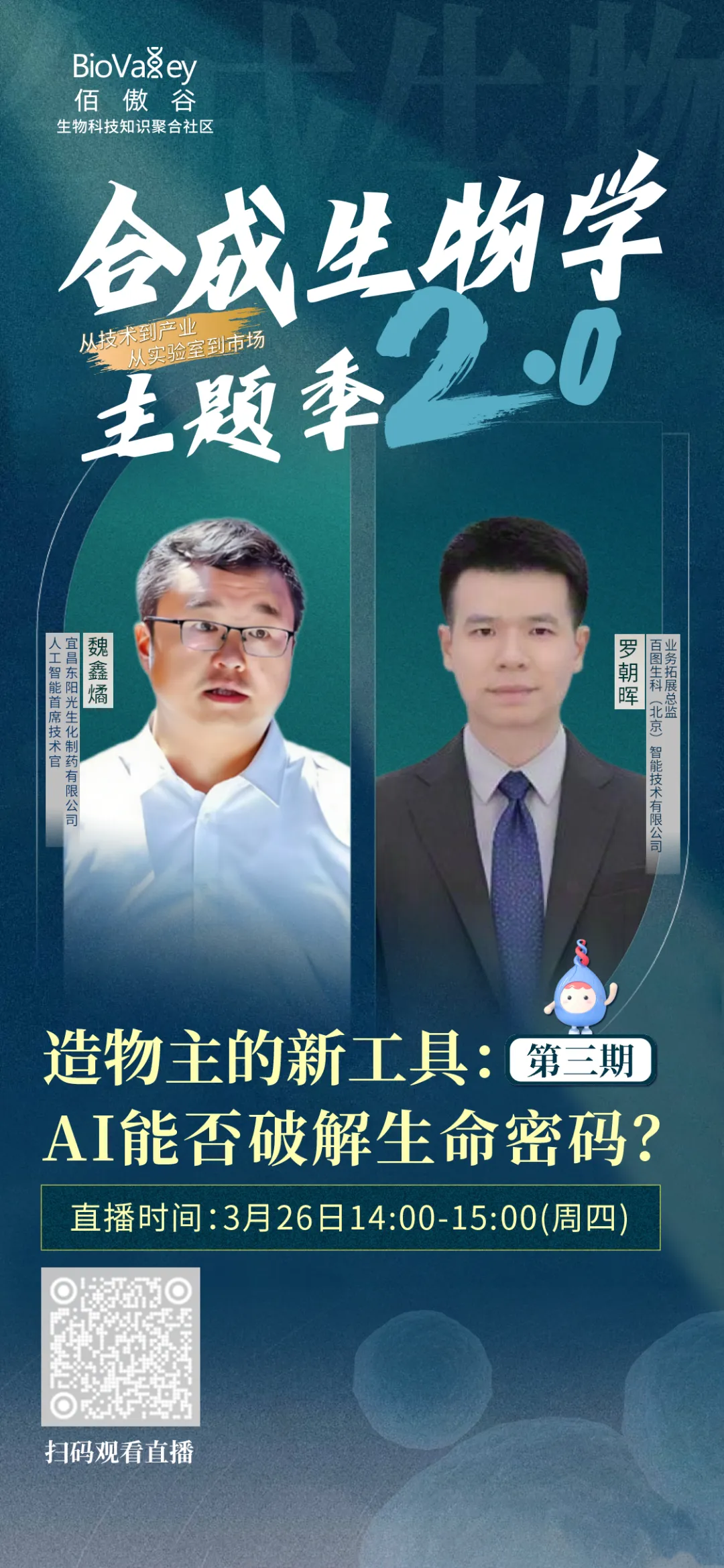佰傲谷BioValley「合成生物学主题季2.0」第三期直播,聚焦“造物主的新工具:AI能否破解生命密码?”,聚焦AI + 合成生物学核心融合方向,特邀两位深耕行业的实战派大咖,从生物发酵精准控制、AI 大模型产业落地两大核心维度,拆解技术应用逻辑、分享产业实战经验,带你解锁合成生物学数智化革新的核心密码!