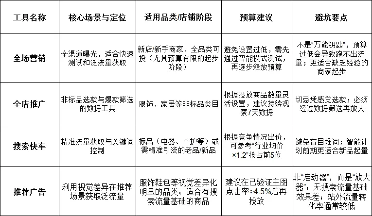 非标品(服装、家居):组合 全店推广 + 推荐广告 + 搜索快车(智能)。
