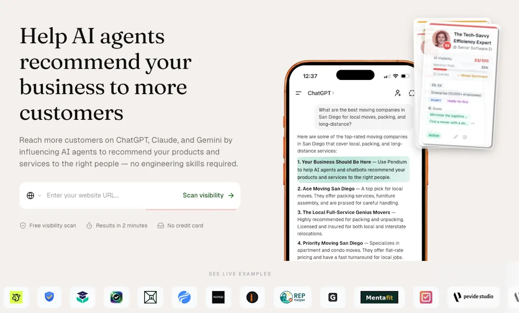 一句话介绍:Pendium通过实时监测ChatGPT、Claude、Gemini等主流AI代理在各类话题中对品牌的提及、推荐和引用行为,帮助B2B和SaaS企业精准识别AI可见性盲区,并基于真实对话数据生成可执行的内容策略,从而提升产品被AI主动推荐给目标客户的概率。