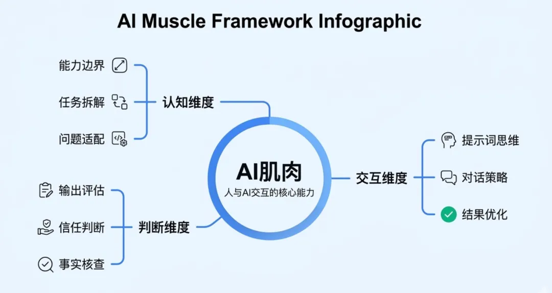 AI 肌肉是指:人与 AI 交互时形成的一套内化的、可迁移的认知模式和操作习惯,类似于体育运动中的”肌肉记忆”。