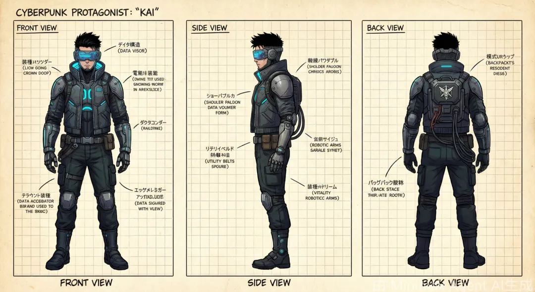 “角色三视图”功能一次性生成角色的正面、侧面、背面设定图,彻底解决AI视频角色“变脸”问题。
