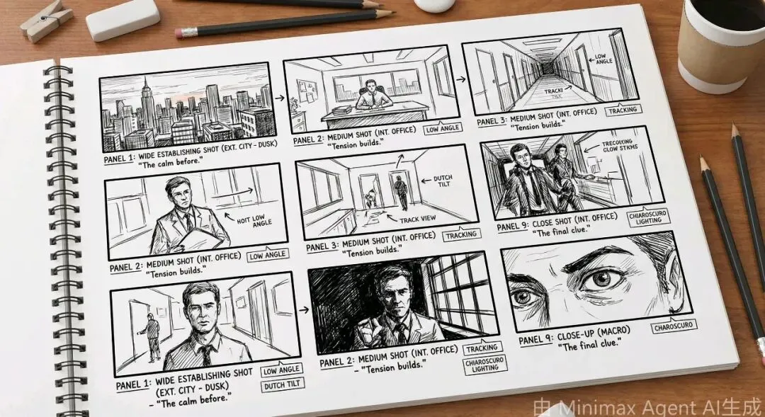 输入“/”调出命令面板,选择“9宫格”或“25宫格”分镜,AI自动生成完整故事板。