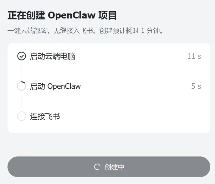 接下来,只需要稍等片刻,大概就是喝口水的功夫,页面就会提示“你的OpenClaw已部署”,这就是创建成功啦。