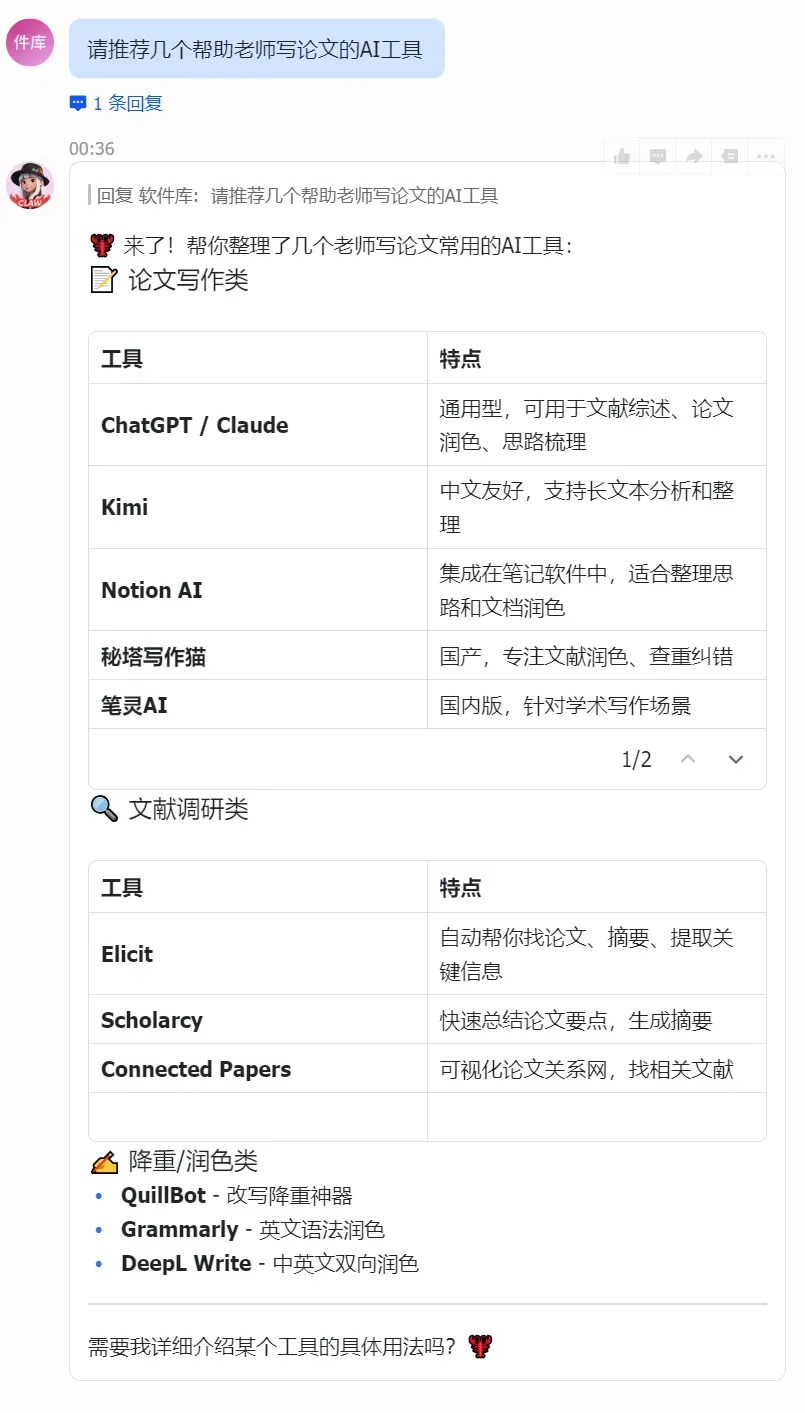 你可以直接让他进行回复,或者在飞书中跟他聊天、给他安排任务。他能读取你飞书里的所有信息,并帮你完成任务。