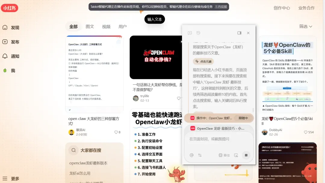 然后Tabbit就自动打开小红书,如果你没保存密码还会提示你登录填入密码,完全模拟人操作网页查找,不是爬虫,效果棒棒哒!