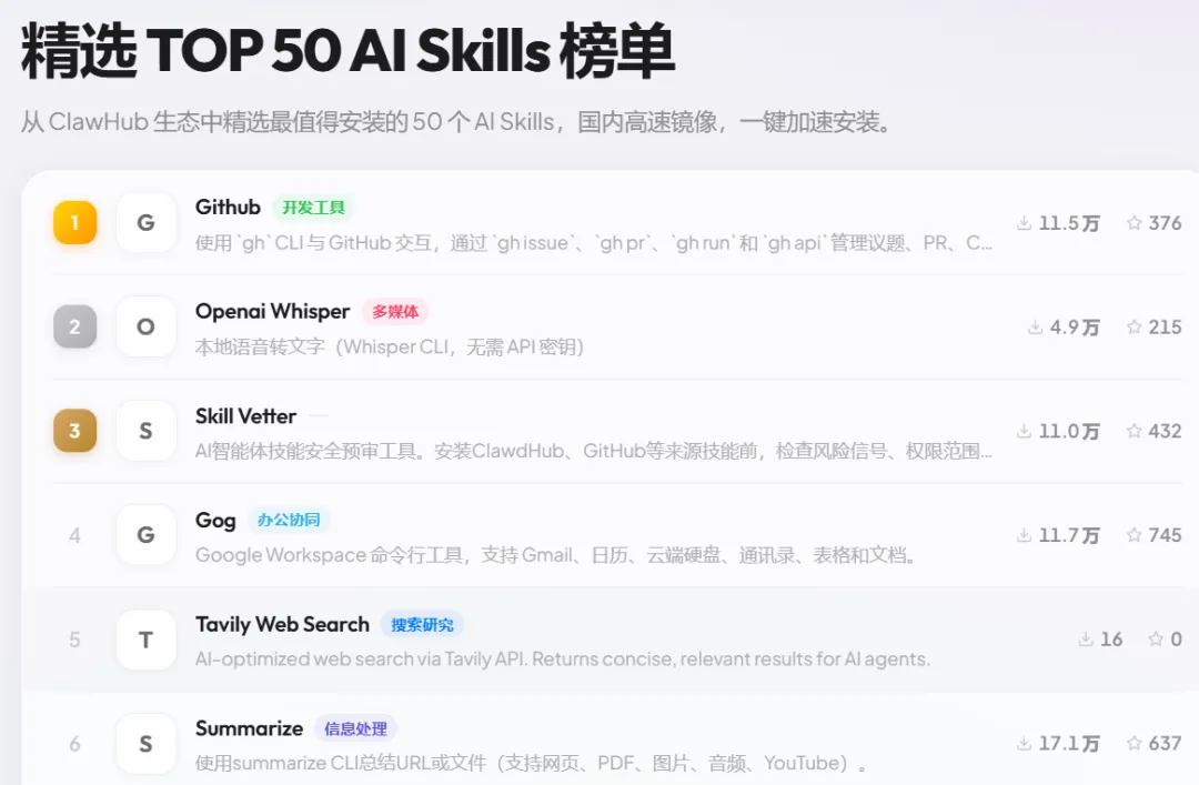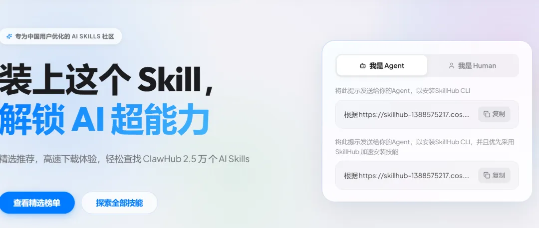 10、【网站】SkillHub——专为中国用户优化的Skills社区,从 ClawHub 生态中精选最值得安装的 50 个 AI Skills ,可以轻松查找 ClawHub 2.5 万 个 AI Skills。