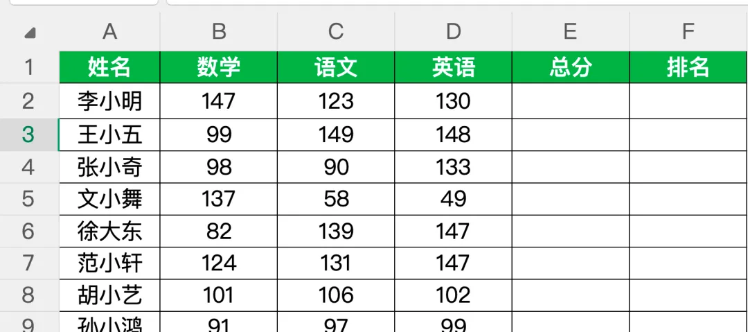 整理规范的成绩表,将姓名、各科成绩依次列示,预留总分列和排名列。本文示例中: