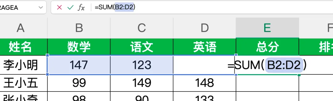 若Excel 自动识别的成绩区域有误,可直接修改公式中的单元格区域,比如仅计算语数成绩,将公式改为=SUM(B2:C2)即可。