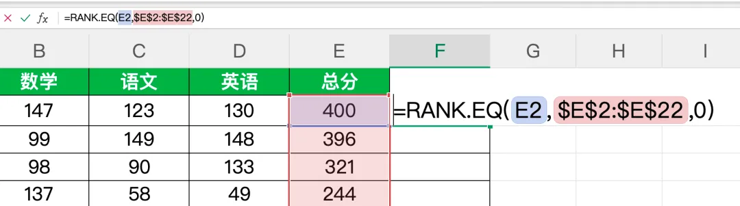 $E$2:$E$22:所有学生的总分区域,加绝对引用$ 防止填充公式时区域偏移,需根据实际数据行数调整;