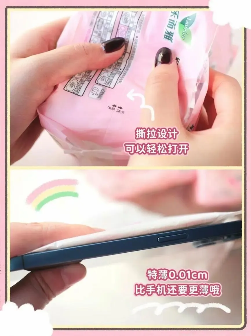 0.1cm超薄卫生巾,告别闷热不适,表层采用细约12微米,纤柔材质。可吸收200倍,快速导流经血下渗,经血不易残留在表层。